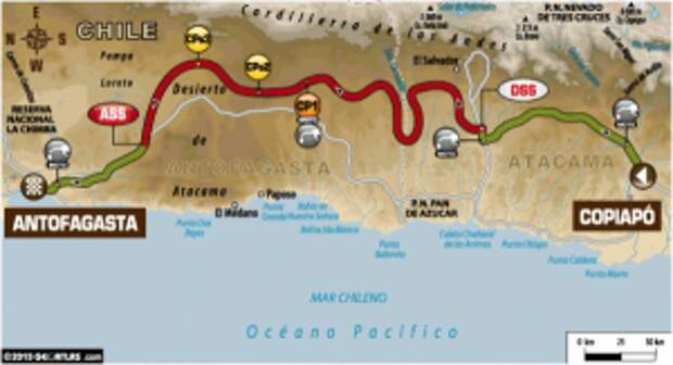 На пятый день участникам ралли-марафона Дакар пришлось преодолеть почти семьсот километров по пыльным дорогам пустыни Атакама. Длина спецучастка дня составила 458 километров - это третий по протяженности СУ на этой гонке. А для грузовиков это и вовсе...